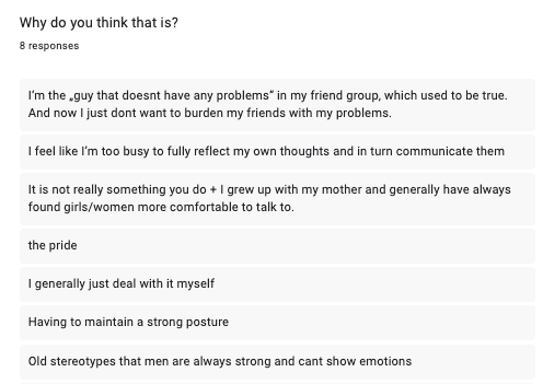 Men aren't encouraged to speak up enough. A survey on 1000 men in the UK showed that 40%. have never spoken to anyone about they're mental health. Why don't they speak up? Most say they've learnt to deal with their issues themselves or don't want to be a burden. nearly 30% feel embarrassed and 20% feel that there's a negative stigma around this. (Priory, 2021)