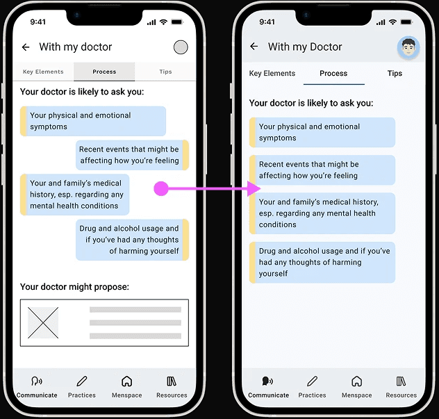 Learning to be vulnerable and show emotions can be daunting. For maximum support and comfort information should be provided in digestible portions. Additionally, templates and assistance on how to get started when users struggle to express themselves would be helpful.