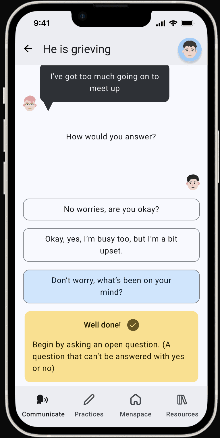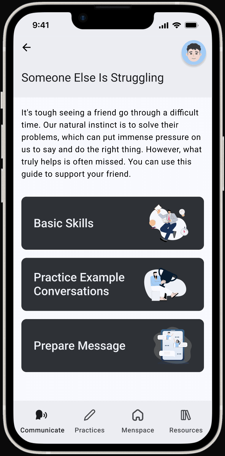 Whether you are struggling or someone else, not knowing how to have a conversation about it, is the main obstacle. This platform helps you learn and practice these skills in a clear, supportive and interactive way.