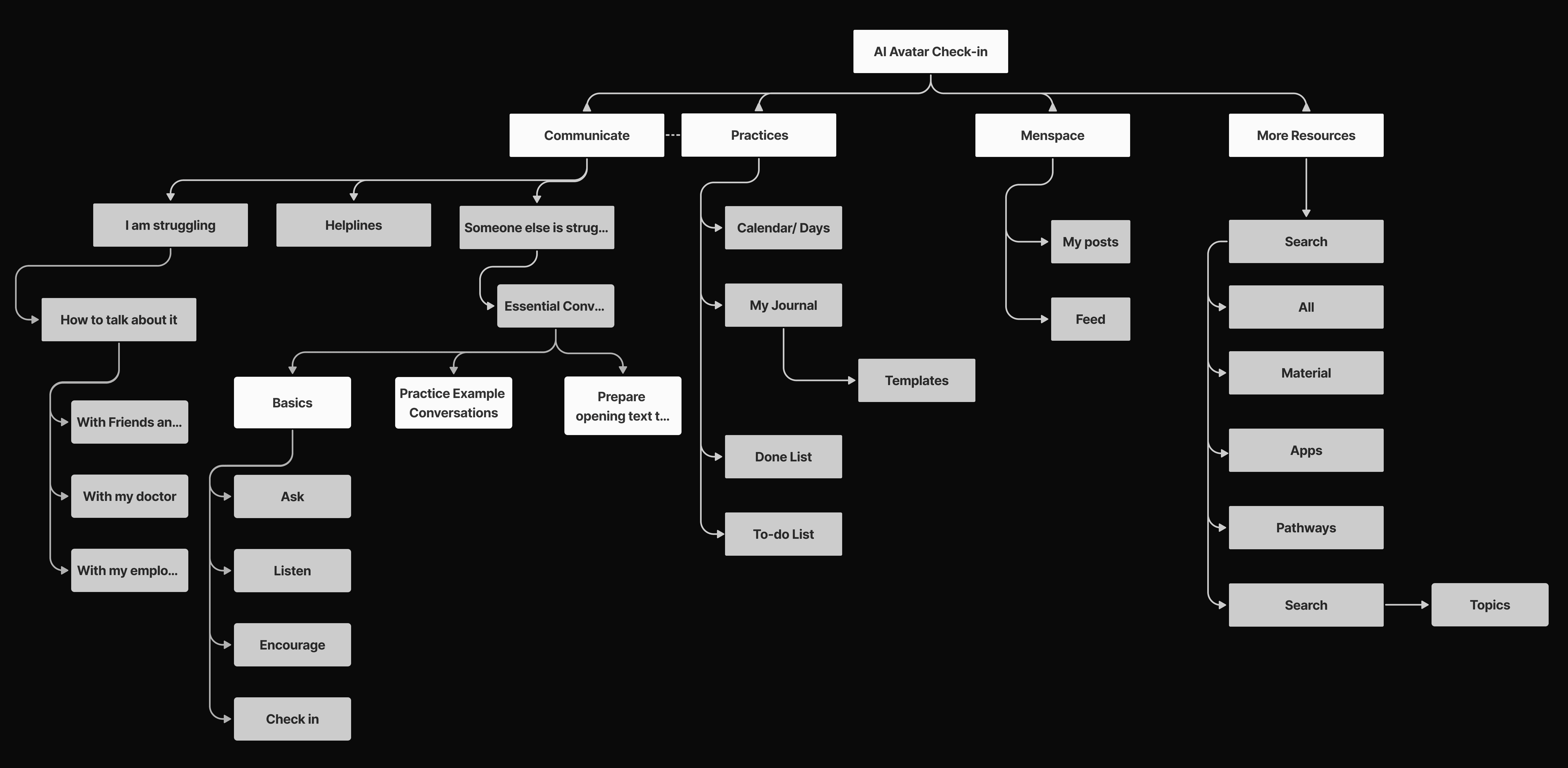 The user flow maps how each persona navigates the experience based on their emotional state, motivations, and barriers to engagement. Instead of assuming a single linear journey, the flow supports different journeys and outcomes, allowing users to progress at their own pace.