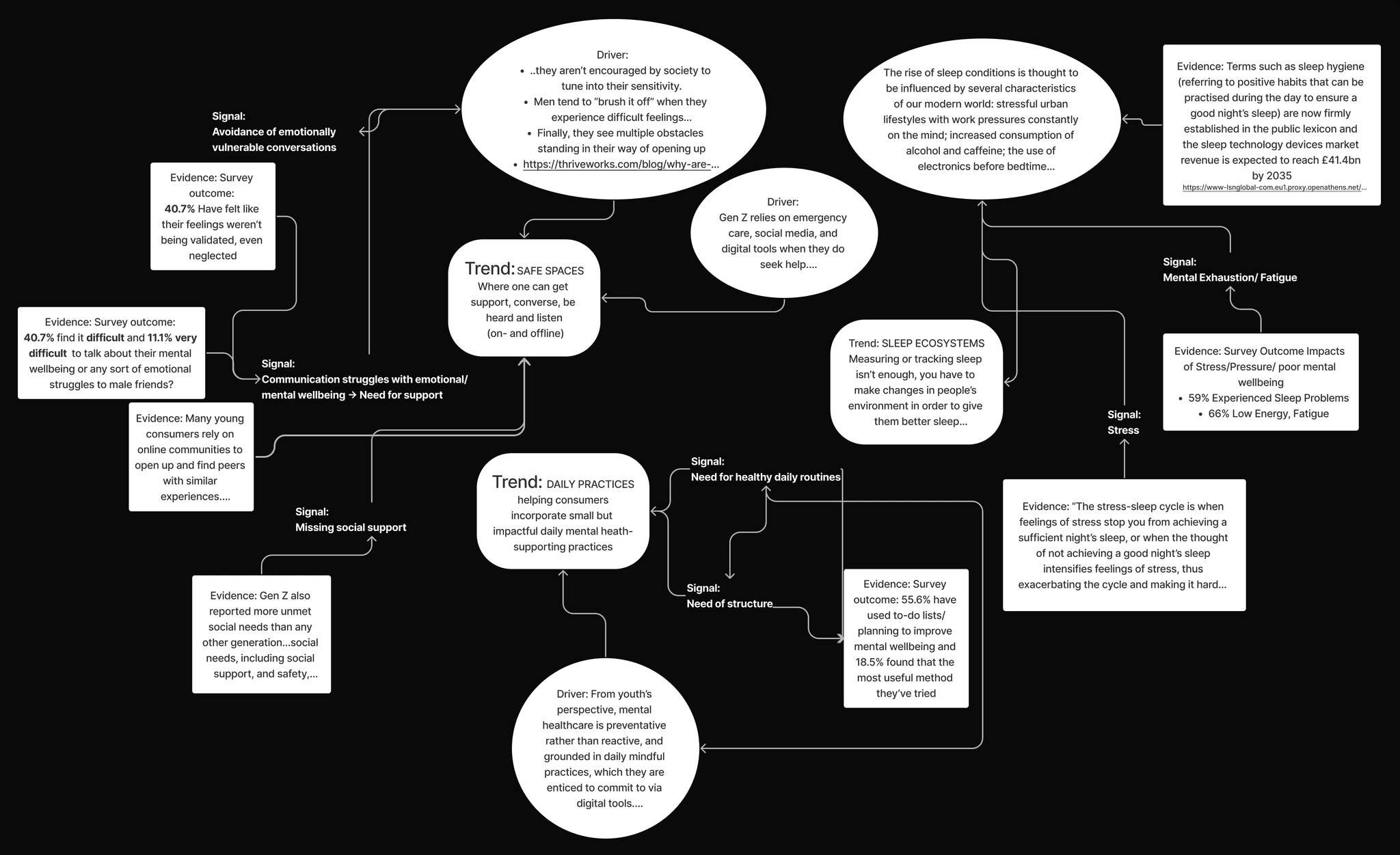 Trends forecasting helped me comprehend the evolving needs, preferences and behaviours of my audience, along with the wider impact of social, cultural, and technological factors. I've identified signals and drivers leading to 3 trends: The need for safe spaces, the need for incorporating daily practices and structure in life and the rising trend of sleep ecosystems. I’ve decided to focus my app on the first two of these trends.